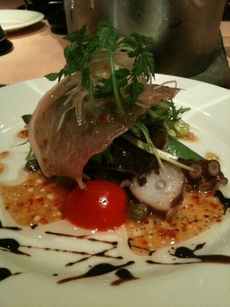 前菜。タコのマリネと思いきや、生ハムの下にカツオが隠れています